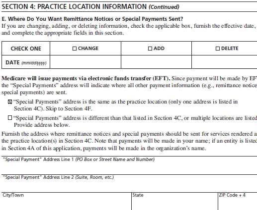 Part E identifies your special payments address (where claims payment communication is mailed)
